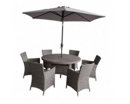 The Parma 6-Seater Round Dining Set combines style, comfort, and durability, making it the perfect addition to your outdoor living space. Designed with an all-weather aluminum frame and UV-protected rattan, this garden furniture set is built to withstand the elements while maintaining its elegant appearance. The spacious 1.4-meter round table is topped with a durable polywood top, offering elegance and practicality for dining or entertaining. This set includes six comfortable chairs complete with plush seat and back cushions for added luxury. To provide shade on sunny days, the set also features a 3m crank-and-tilt parasol, ensuring comfort and convenience. With its timeless design, the Parma dining set effortlessly enhances patios, gardens, and outdoor spaces of all styles. Includes a cover. Parasol base sold separately.