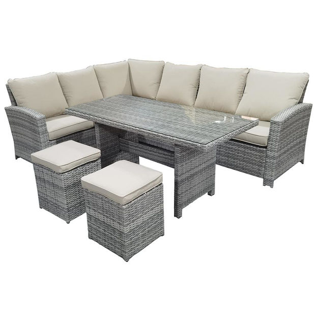 This Tuscany Rattan Corner Dining Set offers comfortable dining for up to six people. This set is made from the highest quality weather and water-resistant resin weave handwoven onto a lightweight but strong aluminium frame. The rectangular table is finished off with a 5mm tempered glass table top. This set coordinates beautifully with other dining options in the full Tuscany collection. Dimensions: Table: 3 Seater Sofa: H83 X W176 X D76Cm, 3 Seater Corner Sofa: H83 X W193 X D76cm, Coffee Table: H70 X W150 X D70cm; Stool X 2: H48 X W39 X D39cm.